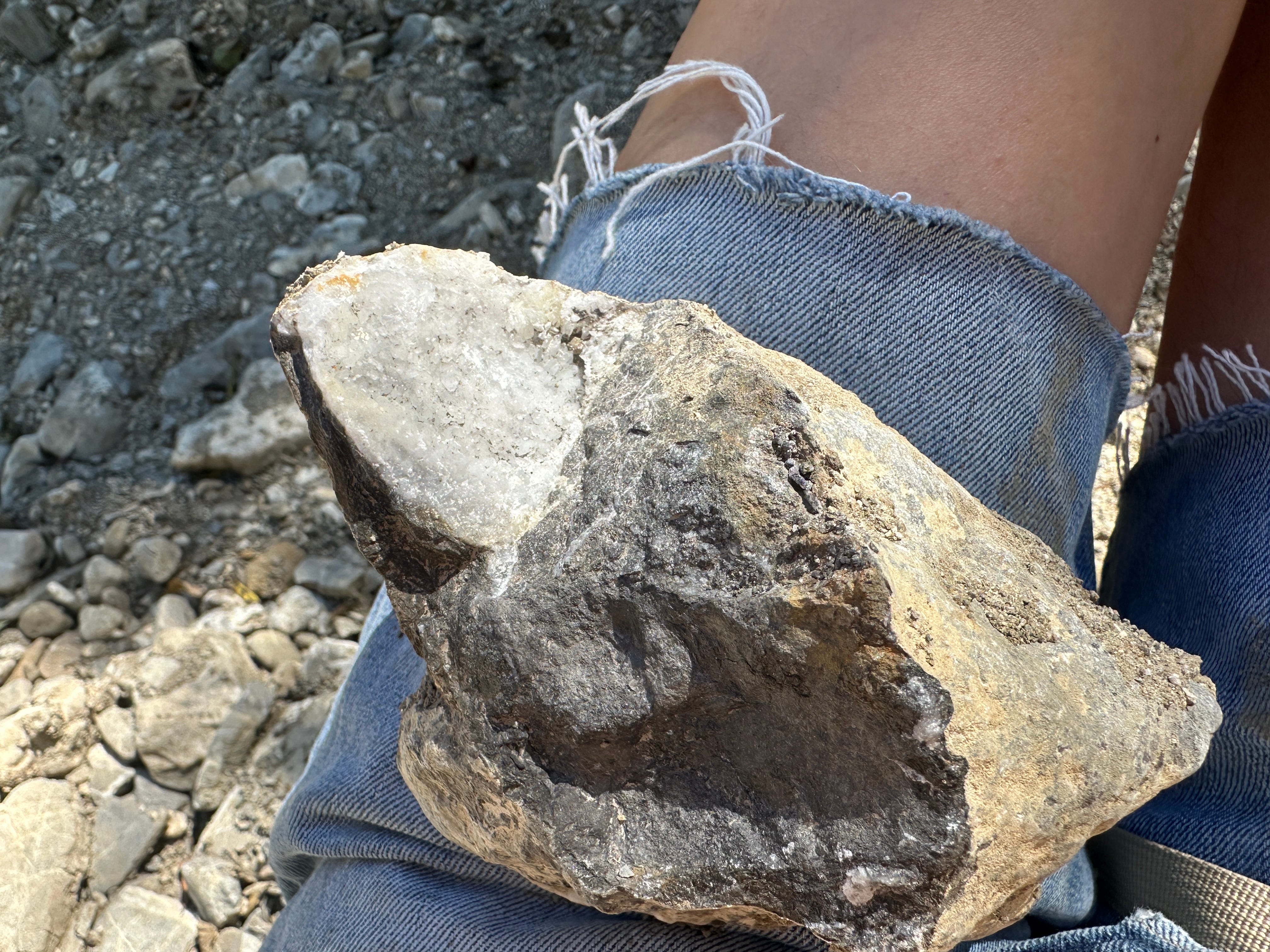 My headache persists so I am slow and not strong. But my body wants to move. I take it for a walk to the dried and dug up river bank. Looking for a place to sit and stare I pick another willow tree. I spot something sparkly. A broken stone reveals crystals. I pick it up and carry it home. I am 47 years old and I am still like that kid collecting rocks and fossils and shells in their pocket. Although this one didn’t quite fit in my pocket.